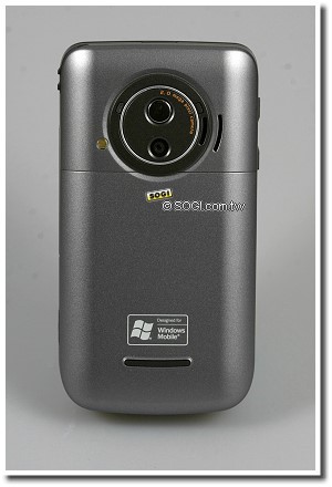 在背面部分,在看似沈穩的深鐵灰色上,有一個造型極為明顯的相機鏡頭,不過也就這麼多了,剩下的就只有電池蓋上的 Windows Mobile 的圖案,為了避免放在傾斜的桌上會滑落,也設計了橡膠條減少滑落危險,在電力部分,採用 1300 毫安培的 Xda Zinc,通話時間為 300 分鐘,待機則為 200 小時。