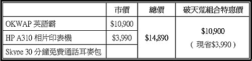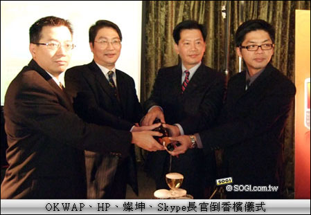 國內手機大廠 OKWAP、3C 通路燦坤、影像事業 HP 以及愈益普及的 Skype 網路電話服務四家廠商的長官不可免俗地舉行倒香檳儀式,除了宣傳自家產品之外,也一致表示,此次跨領域結合各產業優異的廠商與通路優勢,定能再創銷售佳績,充分表現對彼此結盟廠商的信心。