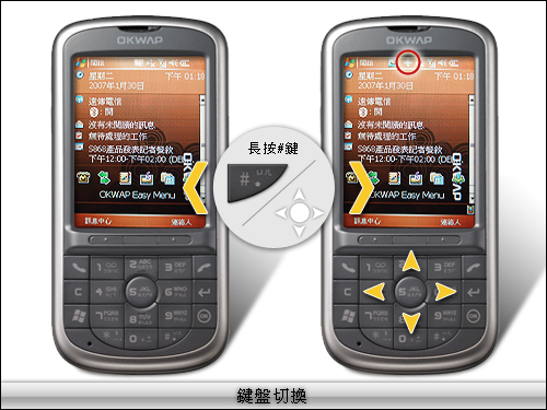 OKWAP S868 還有獨家切換「五向鍵」的功能,為了讓消費者如同使用一般最普及的手機一樣,數字按鍵的 24568 同時具有方向鍵的功能,簡單利用方位完全相同、以及民眾的使用習慣來操作目錄選單。只要長按「#」字鍵,右上角選單就會跳出切換模式的小圖,此時就表示已經從「數字按鍵模式」切換為「方向鍵模式」,操作方法相當簡單,此項創意也相當人性化。