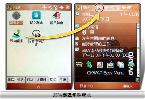 S868 具備藍芽 2.0 傳輸功能,支援 SD 記憶卡擴充,並延續旗下行動英語學習的優勢,內建朗文字典與即時翻譯等程式。此外,S868 可將「即時翻譯」點圖拉至螢幕上方,就如同 PC 桌面上「捷徑」的原理一樣,使用者可以在瀏覽網頁、查看 word 文件或操作其他功能的同時,隨時點選「即時翻譯」查詢不懂的單字或文句。