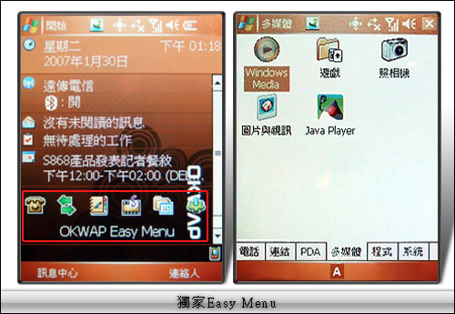 OKWAP S868 特別於螢幕下方設置了一個「EasyMenu」,也是市面上 PDA 手機所沒有的獨特功能,設置在螢幕下方的簡易目錄鍵,就等同於一般手機的九宮格目錄,是一項貼心幫助使用者快速上手的獨家軟體。