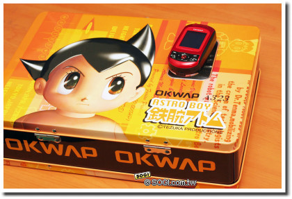 OKWAP A323 原子小金剛特別利用鐵盒來當作外包裝,相當的精美,讓消費者一眼就可看出這款手機的代言人,以及產品訴求,期望透過這樣的方式,打造出有如日系漫畫的活潑感。