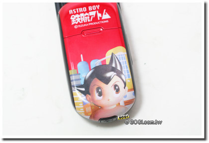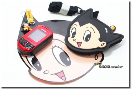在隨機附贈的配件部分,同樣延續精美外包裝的鐵腕風,專屬的手機套讓原子小金剛的特色一覽無遺,尤其是那雙活靈活現的大眼睛,和頭頂上方的兩個犄角。此外,這款手機套同時也可當作隨身的零錢包使用,背帶採取可拆卸式,使產品的應用趨向多元化。