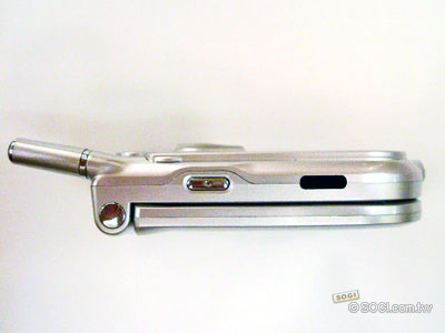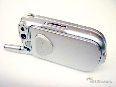 天線為傾斜式的設計,是為了避免在旋轉螢幕時,被轉過來的螢幕「卡」到。圖中可看到拍照鍵以及紅外線槽,不過紅外線和以前OKWAP的手機一樣,只能和OKWAP有支援紅外線的手機對傳電話簿,並不能傳輸鈴聲、圖片以及相片,真的是一大缺憾!相信有不少人為此感到失望吧!