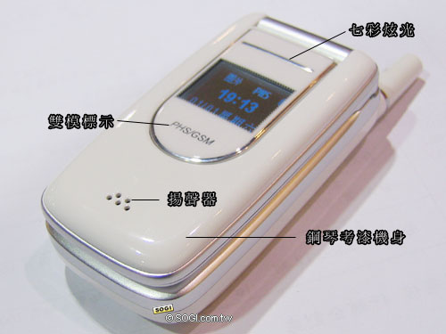 具有接收 PHS 與 GSM 系統的 PHS PG901,號稱是全球最輕巧的雙模機。資訊月現場,大眾電信一共展示了 PHS PG901 二款彩殼顏色。