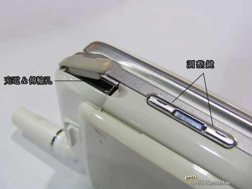 在機身側邊設計處,PHS PG901 擁有可調整音量大小的調整鍵設計,此外,充電器與 USB 傳輸線插孔亦在側邊處,除了音量調整鍵與 USB、充電器插孔等設計之外,在 USB、充電器插孔旁邊還有一個耳機插孔設計,這些機身週邊的設計正可顯示出 PHS PG901 幾項實用的小功能。