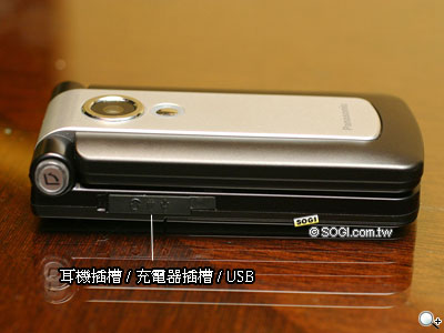 Panasonic VS6 外型極為輕薄,在機身側邊處,除了保有一按及開鈕之外,在插槽的設計上也採用三合一的方式,可同時接上耳機、充電器與 USB 傳輸線,此三合一設計除了可避免機身上到處充滿著坑坑洞洞之外,也不會造型輕薄時尚外型上之美感缺陷。