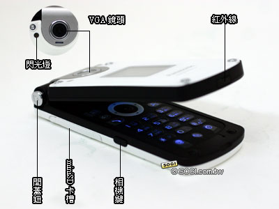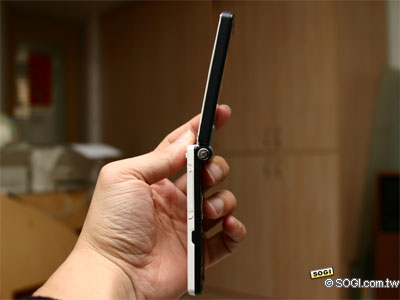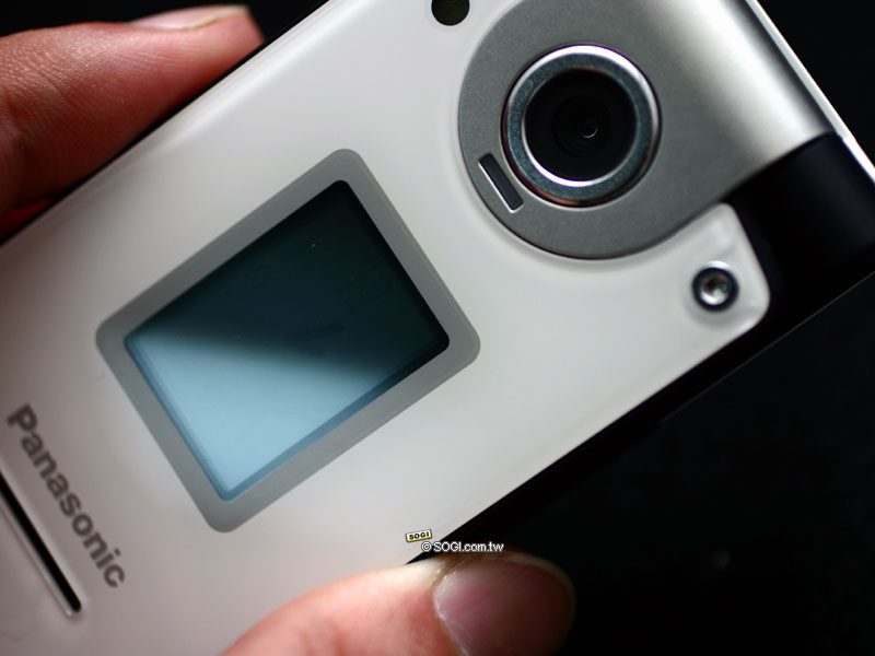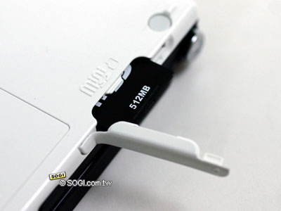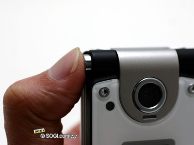 上圖開蓋鈕就是承襲自 Panasonic X400 的「單鍵開蓋」功能,也就是只要用左手姆指按一下,就可以將上蓋直接開啟,不用在用手指撥個半天了。另外機身側面還有 miniSD 卡的插槽,支援的 miniSD 卡容量,經過小編測試,至少可以到 512 MB 的容量。相機鍵同時可以當作外螢幕的顯示鍵,可以切換外螢幕顯示的資訊。