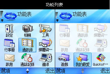 Panasonic X800 內建的功能列表如下,其中比較特別的就是 Quick office 這個軟體了,這個軟體可以觀看 Word, Excel 以及 Power Point 三種最常用的文件,只要將文件檔案存到記憶卡裡,就可以直接閱讀,商務人士可以節省一些通勤時間。而下圖右則是「我的最愛」功能,也就是捷捷列,可將常用的功能放在這裡,直接呼叫。