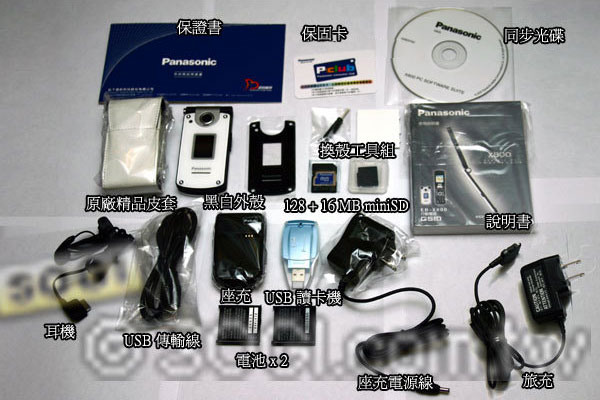 下圖是其所有配件的全圖,真是目不暇給對吧!?而其中原廠精品皮套裡還有一個精緻的手機吊飾,搭配 Panasonic X800 的氣質,將更為出眾。以下茲以列表以及相片相照來瞭解其內容: