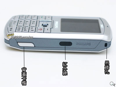 在機身側邊的設計上,為了強調整體手機的簡約造型,Philips 362 僅具有紅外線的設計,其他功能快捷鍵幾乎都省略而沒有出現在機身側邊處,這裡比較特別的是,Philips 362 在機身上方的左右兩側,皆各自擁有一個手機吊飾孔的設計。