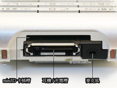 機身下方的擴充區,與一般設計無異,比較特別的是 miniSD 插槽是設計在靠近正面這一邊,而且要把電池蓋取下才可以熱插拔。購買時原廠會附送 64 MB 的 miniSD 卡,以及下下圖的雙耳立體聲耳機。