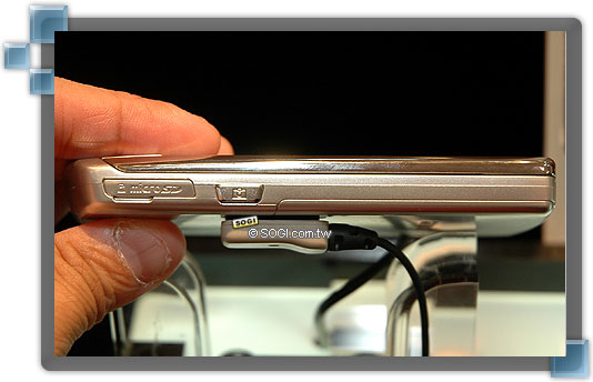 SAMSUNG U708 擁有超薄的 12.1 mm 機身厚度,在機身側邊處可清楚的看見其相機快捷鍵與所支援的 microSD 記憶卡擴充槽,而其本身內建的記憶空間則為 20MB。
