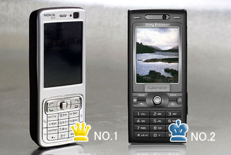 K800i 緊追在後,第 4、5 名又分別被 Sony Ericsson K750i 及 Nokia N93 盤據,兩大廠在五名之內的角力戰情勢甚囂塵上。這樣的情況在