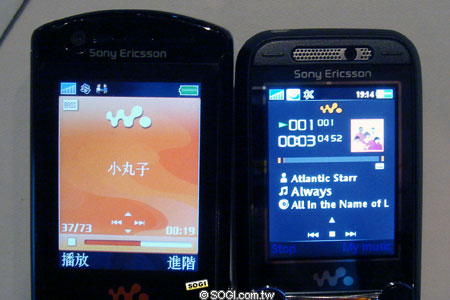 以下是 Walkman W900i 和 W850i 的音樂播放介面比較,W850i 的 Walkman 2.0 版本可將專輯圖片放入手機,播放的時候都會顯示專輯圖片。操作介面除了更直覺化之外,也更為美觀。