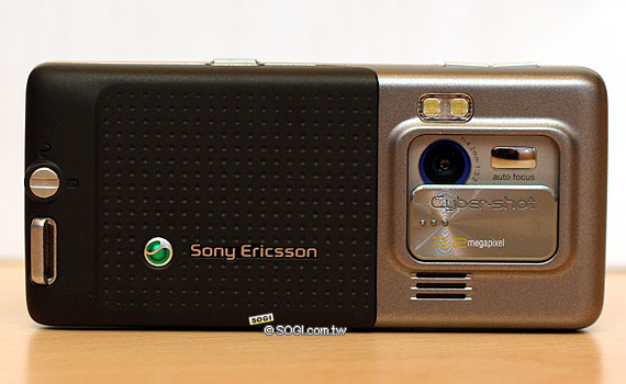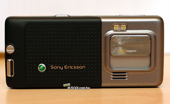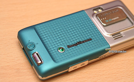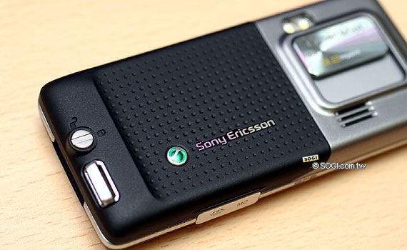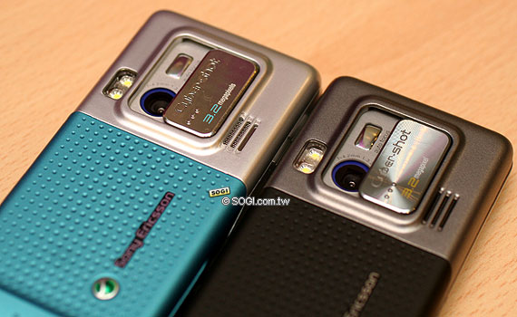 再來是背面的部份,背面手機主要顏色的部份有數不完的圓孔,這個設計是否有防滑的效果,目前還無法確定。而上面的相機鏡頭部分兩款手機都是銀色,採用了滑蓋式的鏡頭,與 K810i 的相似度極高。但其鏡頭外蓋材質似乎是金屬感較重,K810i 則是有點帶鏡面、觸感較滑。閃光燈則是在滑蓋鏡頭蓋的上方,不過它並非採用氙氣閃光燈。