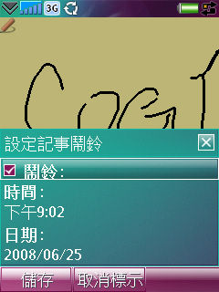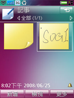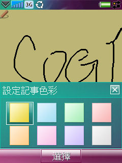 G700 和 G900 主打的就是這個手寫便簽功能,無論在使用什麼功能,只要按下圓形的便簽按鍵,就能進入手寫和塗鴉以記事的便簽功能。在輸入的時候,有 8 種顏色的背景,還可以設定鬧鐘和分類來提醒自己。尤其最近盛行節能減碳,在手機隨時手寫和塗鴉的方式,的確能減少便條紙的浪費。