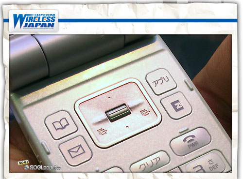 Sony Ericsson W53S 另一個焦點在於底座中央加入了 Sony Ericsson 特有的「+JOG 導覽鍵」,操作的原理乍看之下與 LG Shine 的全新三向滾輪設計頗為相像,操作上非常便利,可以加速選單的瀏覽和選取。