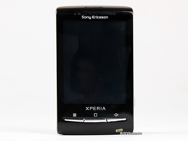 ▲Sony Ericsson XPERIA X10 mini 螢幕下方的三顆硬體按鍵功能由左至右分別為選單、Home 以及返回,比起市面上其它 Android 手機少了一個搜尋鍵。