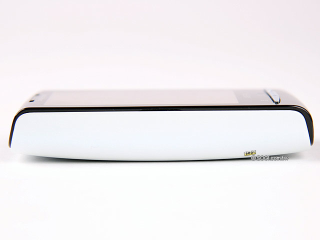 ▲Sony Ericsson XPERIA X10 mini 機身頂部只有一個兼任按鍵鎖功能的電源鍵,不過我們可以看出 Sony Ericsson XPERIA X10 mini 正面機身從機頂延伸到底部,構成無接縫與柔和的曼妙曲線。