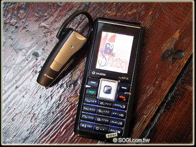 全球手機吹起一股輕薄潮流,擁有純正法系血統的 SAGEM 繼 LV 特約設計師親自操刀設計的 my X-8 之後,再度以 my 401X 掀起科技美學風。SAGEM 最酷造型機 my 401X 即將於 2006 年新春以超窈條曲線登台。上圖手機旁邊的藍芽耳機便是 Sagem my 401X 手機隨機附贈的原廠藍芽耳機(市價約 3,000 元)。