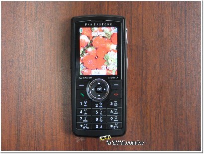 客製化的 Sagem my501X,在螢幕上方就會自然地打上遠傳的英文字樣,就算你不喜歡也沒辦法,這就是客製化手機的宿命。