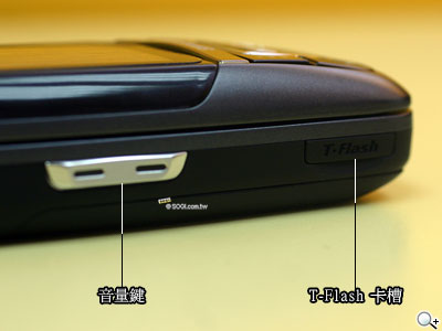 左側的機身,有音量鍵以及 T-FLASH 的記憶卡插槽,讓它比較 D508 更有實質上的擴充能力,不單單把內建 80 MB 記憶體提升至 90 MB 而已。