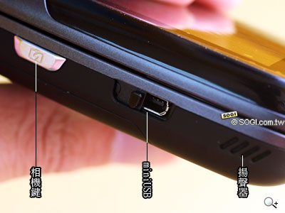 下圖是機身右側的相機鍵,以及加了保護蓋的 miniUSB 傳輸槽。