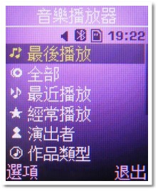 優雅音樂精靈進入主目錄中,可以看見十分熟悉的 Samsung 操作介面及功能圖示,進入音樂選項後,播放器會列出各個清單項目,包括:最後播放、全部、最近播放、經常播放、演出者、作品類型…等類別,使用者能夠針對所需來開啟個人檔案。