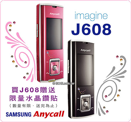 Samsung Anycall J608 類琉璃鮮豔設計,滑蓋光感外型,色澤亮眼強烈,猶如寶石般絢爛奪目,讓人忍不住搶先擁有,建議售價為 NT$6,900 元,兩款官方顏色為粉色與黑色,同時因應時下流行的「Bling ! Bling!」風,Samsung Anycall 特別提供給愛好流行時尚的消費者更加精緻炫目的獨家贈品,即日起只要購買 J608 手機,立刻隨機贈送限量水晶貼,只送不賣,數量有限,送完為止,想要與眾不同的創意設計專屬手機嗎?想要自己的手機成為朋友之間熱烈討論的話題嗎?Samsung Anycall J608 讓你充滿自信,超有型。
