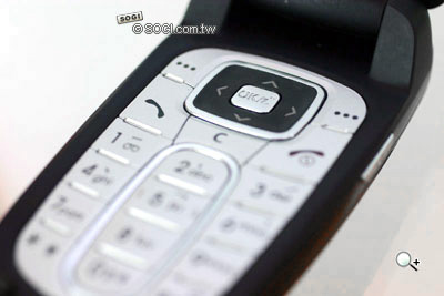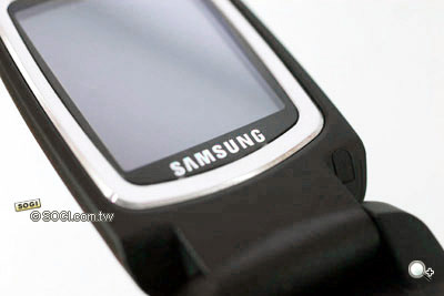 仔細看 SGH-E738 的顏色處理頗有特色,特殊材質處理可以避免惱人的指紋與灰塵殘留,不僅如此,摸起來質感更是一流,不需擔心夏日炎炎流汗造成的黏膩感。圖中可以看到 SGH-E738 的陳穩黑色考漆與亮銀的按鍵的時尚感搭配。