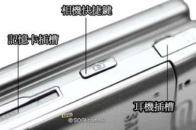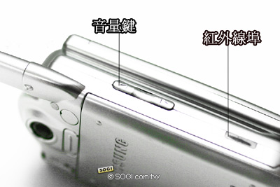 SGH-P738 外型優點不只如此,小地方的設計有頗具巧思,包括許多插槽孔不再使用軟墊塑膠設計,而是採用具「科技感」的金屬設計。左側是「音量調節鍵」、「紅外線埠」,右側為「耳機孔」、「相機快捷鍵」以及「MMC記憶卡插槽」,而底部則是「充電插槽」,與機身一致地採用銀色系,兼具整體感。特別的是,為了方便使用,在插槽孔的外部設計有小小的「突起部分」,是為了方便開啟,而不必擔心一定要用指甲將它摳起,這樣的設計相當貼心與方便。