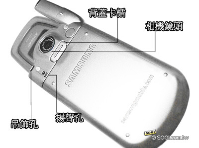 百萬畫素的相機鏡頭鑲在背面,三星的Logo 字樣就在背蓋上方,字樣採用「凹陷式」設計,能夠與整體銀色機身配合,不過使用者就要當心容易卡垢的問題。另外,電池開啟也很容易,卡楯部分好推且容易開闔蓋,密合的相當穩固與精緻!這也是三星一貫的優點之一。