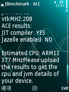 ARM 與 JBenchmark 合作開發的測試程式「ARM CPU Estimator(ACE)」,可測試手機的處理器與 Java 效能,以及 CPU 資訊以及圖表。測試的方法非常簡單,只要將 ACE 程式傳到手機或記憶卡當中,打開程式在手機上安裝即可。安裝完成後,打開 ACE 應用程式檔案並執行,即可就可以看到如 CPU Family、時脈與 Java 效能圖表等資訊。結果顯示,Nokia 5320 XM 屬於 ARM11 系列,執行時脈為 377 MHz,未支援 Jazelle 硬體 Java 加速。