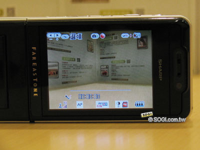 當使用者把 Sharp WX-T91 手機的可 180 度旋轉螢幕翻轉到手機外部時,原本通訊功能的螢幕介面馬上即時轉換至拍攝介面,這時,使用者便可以利用上一頁所介紹的機身側邊相機功能快捷鍵進行拍攝模式的功能選取與設定,如上圖所示,Sharp WX-T91 支援許多相機拍攝模式設定,使用者可以調整影像的亮度、解析度大小、品質與模式 ... 等基本設定。