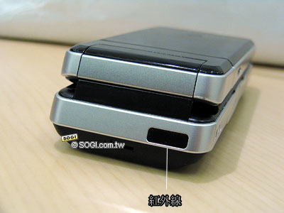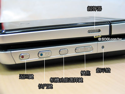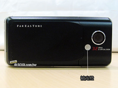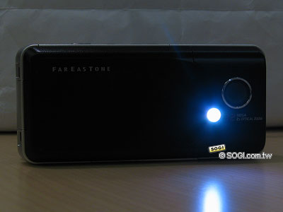 欣賞完 Sharp WX-T91 手機之正面與 180 度可旋轉螢幕之外,接著往手機背面瞧去。Sharp WX-T91 的背面設計完全仿造數位相機的外型設計,非常有質感。在 320 萬畫素相機旁邊則是超亮補光燈,且使用者可自行調整補光燈的顏色。