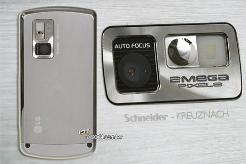 德國光學大廠信乃達 Schneider Kreuznach 的光學鏡頭,第一次被用於手機內建的數位相機之中,對專業相機玩家而言幾乎是不可思議。乾淨設計的機背,搭配髮絲紋金屬光澤,銳利感不言而喻,鏡頭上方標示 AUTO FOCUS、一旁有 2 MEGA PIXELS,下方最大的字體蝕刻出 Schneider Kreuznach 品牌字樣,有老牌光學鏡頭背書撐腰,想必 KE970 的 200 萬畫素很有看頭。