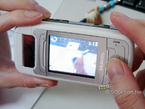 siemens sf65 的螢幕鏡頭雖然可旋轉,可是在一般開蓋的情形下是不會進入拍照模式的,一定要將螢幕轉成整個橫向式才可進行拍攝!其實一點都不麻煩,螢幕一轉到定位立刻會成為拍照模式,而且用雙手抓住整個機身拍照也可大大降低抖手症的比率,想要自拍的朋友們也不用擔心,只要設定定時器就可以搞定摟。另外,相片的娛樂效果:變色、浮雕、加框、文字... 等 siemens sf65 都有內建,接下來會有操作上的介紹唷。