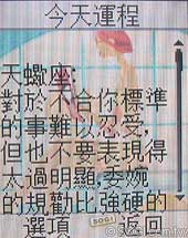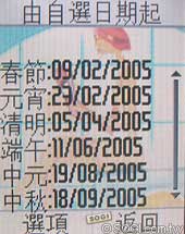 除了百萬畫素拍照、自錄鈴聲之外,Siemens SF65 還內建一款有關「節慶與星座」的功能。相信許多人一定沒有特別去注意農曆的節慶,但有些比較特殊的農曆節慶卻異於標準國曆,而是屬於我們本身國家社會的節慶,只要利用 Siemens SF65 手機的此功能,就能適時的提醒消費者某些農曆節慶即將到來。此外,最熱門的星座論盤也是 Siemens SF65 不可或缺的一項娛樂功能。