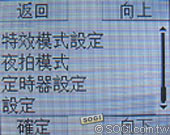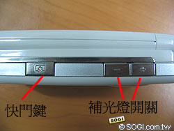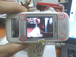 上圖左的四個紅色圓圈處,功能分別是,右邊上下按鍵為調整數位變焦按鈕;左上按鍵功能為橫式、直式照片顯示模式;左下按鈕則是調整拍照解析度與其他特殊拍攝效果模式選擇。