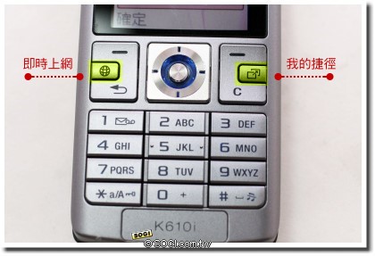 K610i 在螢幕下方的按鍵設計上別有用心,考慮用戶經常使用的功能,因此規劃了許多捷徑鍵:在四方向按鍵上,中央為目錄/OK鍵,上下左右為可自行運用的快捷鍵;而「我的捷徑」鍵與「即時上網」功能鍵(圖示螢光處),則分別設立於目錄鍵與通話鍵下方。