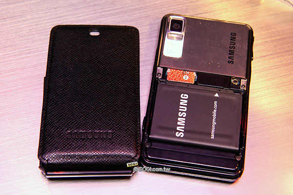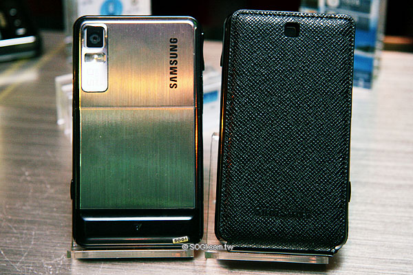 Samsung F488 在上市的盒裝當中,將附贈兩種版本的外殼,讓使用者可以自由的更換。其實就只有電池背蓋的差異,金屬版本的和機身的背面融為一體,整面都有很閃的金屬髮絲紋;而皮革版的則是與電池背蓋連在一起,看起來頗為奢華之外,在通話的時候把皮套蓋上,就可以掛掉電話,和 Giorgio Armani-Samsung 手機一樣。