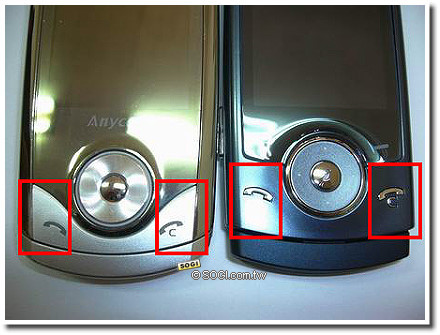 U708(左) 的通話鍵,這個地方是我最無法了解的設計了! 在觸壓按鍵時,因為切割面而有所手感,好似讓人以為可以按壓下去,但其實…也是熱感的拉!這點U600(左) 倒是給人俐落明確許多。
