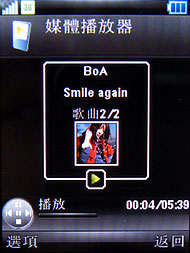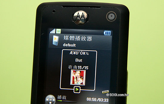 音樂的播放介面,也是與先前 MOTO 的手機完全不同。支援 MP3、AAC、AAC+、WAV 等音樂格式,音樂會自動根據 ID3 資訊分類,也能顯示專輯圖片,並可以透過 Windows Media Player 11 與電腦傳輸。不過,音樂的功能不是很豐富,只有播放模式可以調整,沒有像 V8 還有加強重低音或是一般音樂手機常有的 EQ 功能。