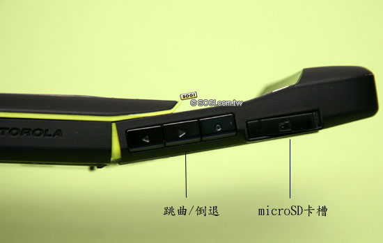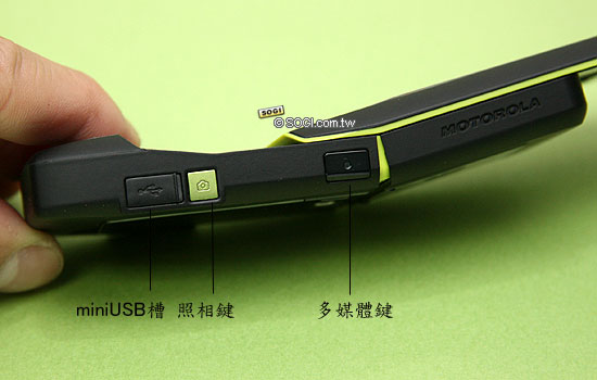 ※ 左側邊按鍵為音樂播放的操作和 microSD 卡槽;右側按鍵是 miniUSB 槽、拍照快門鍵和多媒體快捷功能鍵。