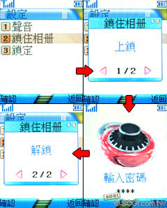 比較特別的是 VK 500 擁有相冊上鎖功能,只要一上鎖,每次瀏覽相冊時就會被要求輸入密碼,上鎖跟解鎖的密碼皆為 VK 500 的手機密碼 0000;除了可將整本相冊鎖起,要單鎖相片或影片都是可以的。