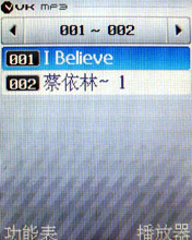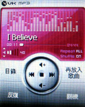 MP3 播放功能已經是許多手機廠商共認的未來主流規格之一,VK 900 當然不能放過這個機會,在鍵盤的設計上,就在五向鍵就有 MP3 功能的快速鍵,只要在待機時按下這個快速鍵,就可以直接連到播放器,這個播放器也看起來很像電腦裡的 MP3 播放介面,滿炫的哦,還可以換三種不同顏色,看你喜歡哪一個!