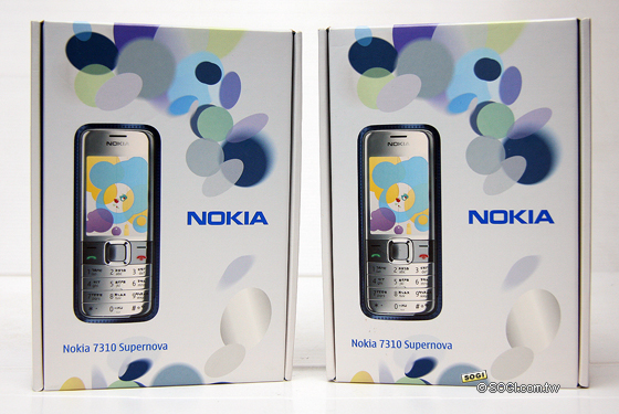 平價的 Nokia 7310 Supernova 盒裝簡單、清爽,除了有手機圖示、型號之外,白底搭配藍綠色系的圓圈輕舞其上,一看就是很適合年輕人的風格。