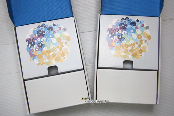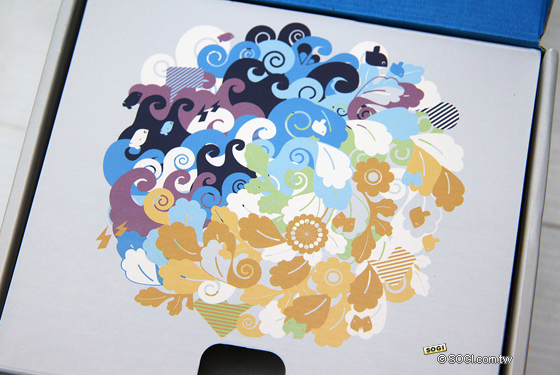 掀開盒蓋,還是沒看到手機的身影,只見一團藍黃色的圓形圖案,實在搞不清楚 Nokia 是在賣什麼關子?仔細瞧,圓形圖案中有藍色、紫色表現的水,綠色、白色的葉子,與黃色的花,可能是想表現 Nokia 7310 Supernova 是 365 天、四季的好伴侶?!