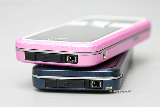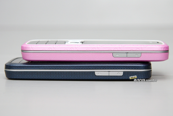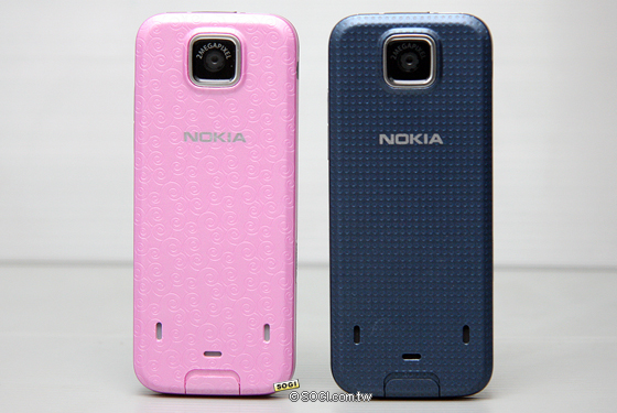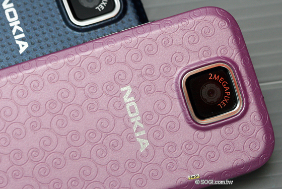 另外一個粉紅、深藍不相同的地方,是「外殼花樣設計」。Nokia 7310 Supernova 在機身正面四邊、機側、機背都包覆了塑料材質的色彩外殼,粉紅色搭配了夢幻感的漩渦雲彩圖樣;深藍色則是以輕鬆的點狀設計。